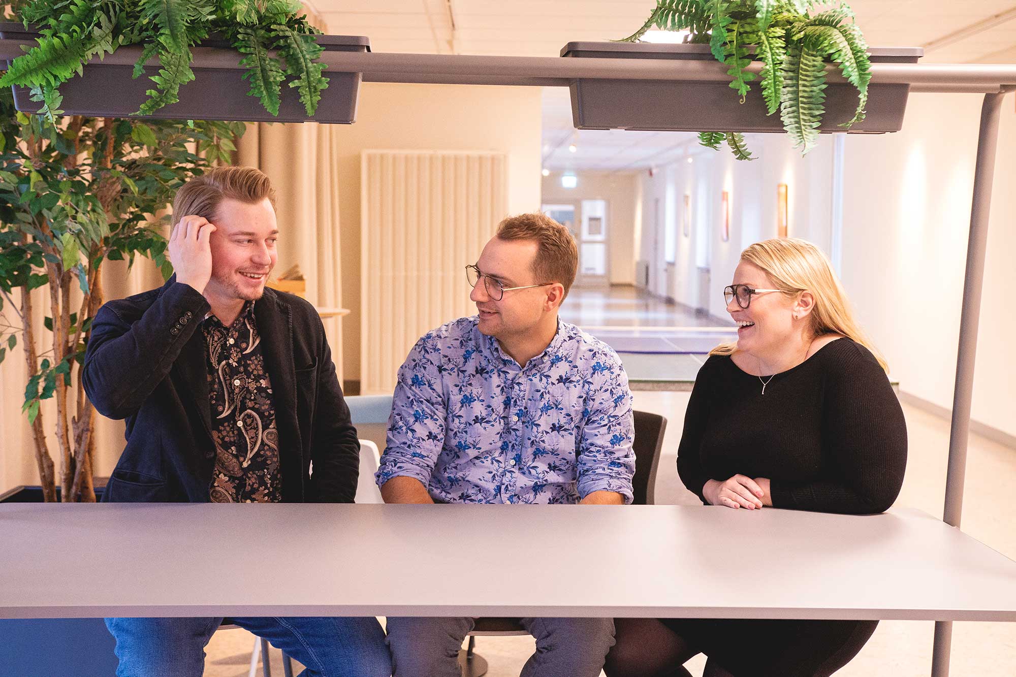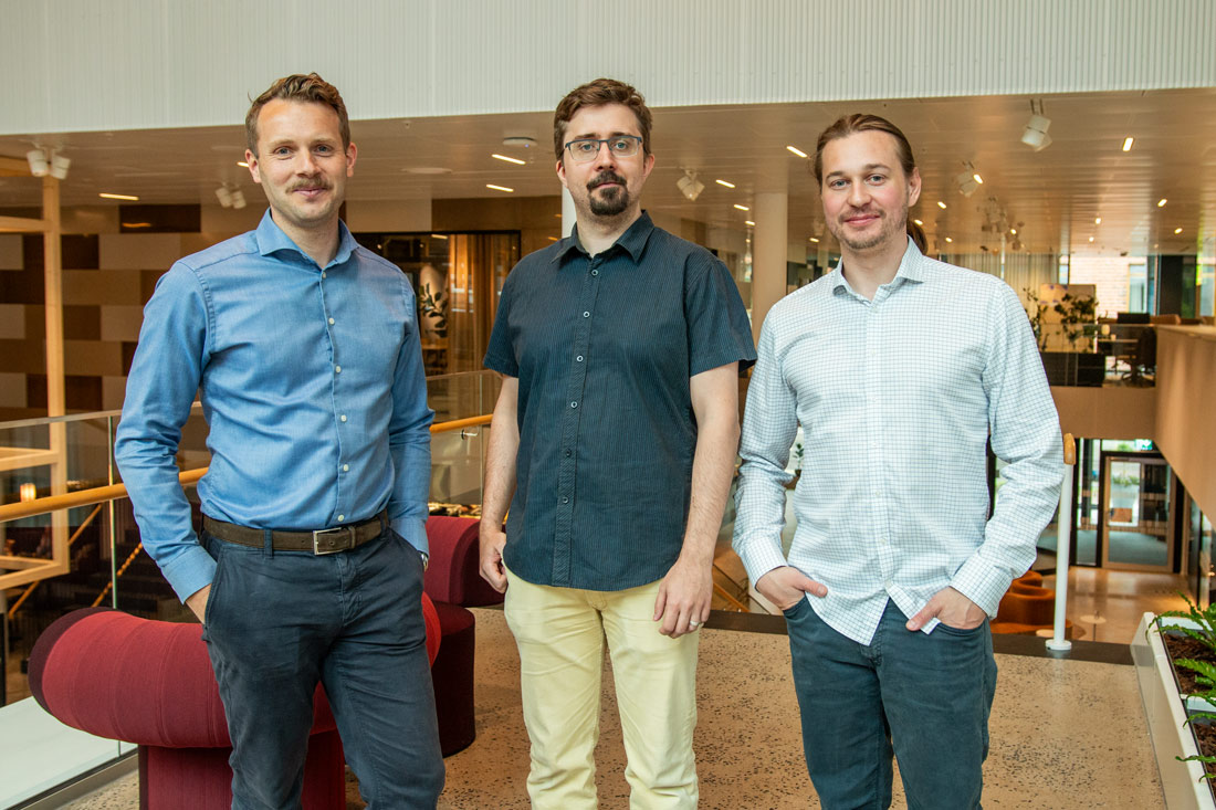 Science Parks affärsutvecklare Henning Lindberg tillsammans med Viking Renhammar och Erik Hermansson från företaget Orthovelox står framför trappan upp till våning två inne i Science Park Towers. Henning har blå långärmad skjorta och mörka jeans, Viking har en mörkblå kortärmad skjorta och beiga chinos på sig, Erik har en långärmad vit skjorta och jeans.