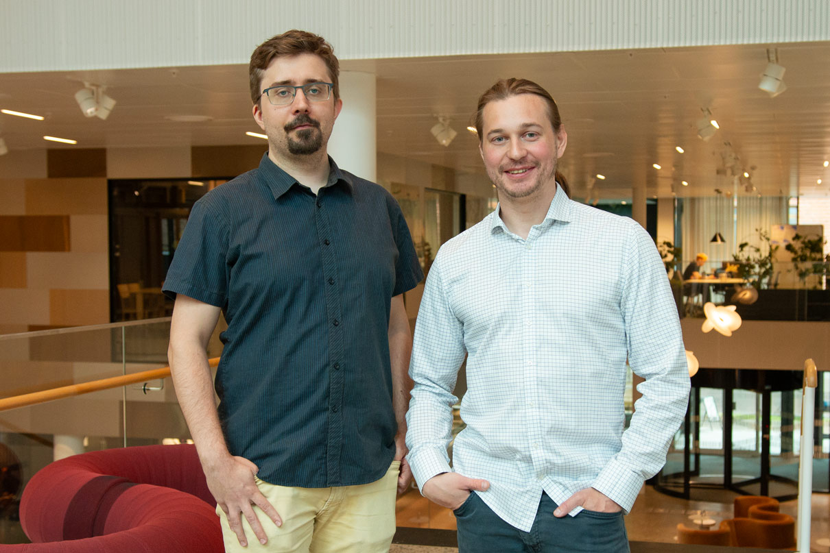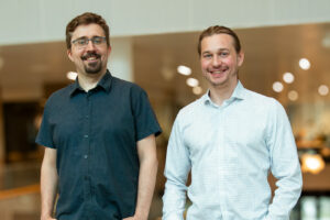 Viking Renhammar och Erik Hermansson från företaget Orthovelox står framför trappan upp till våning två inne i Science Park Towers. Viking har en mörkblå kortärmad skjorta och beiga chinos på sig, Erik har en långärmad vit skjorta och jeans.