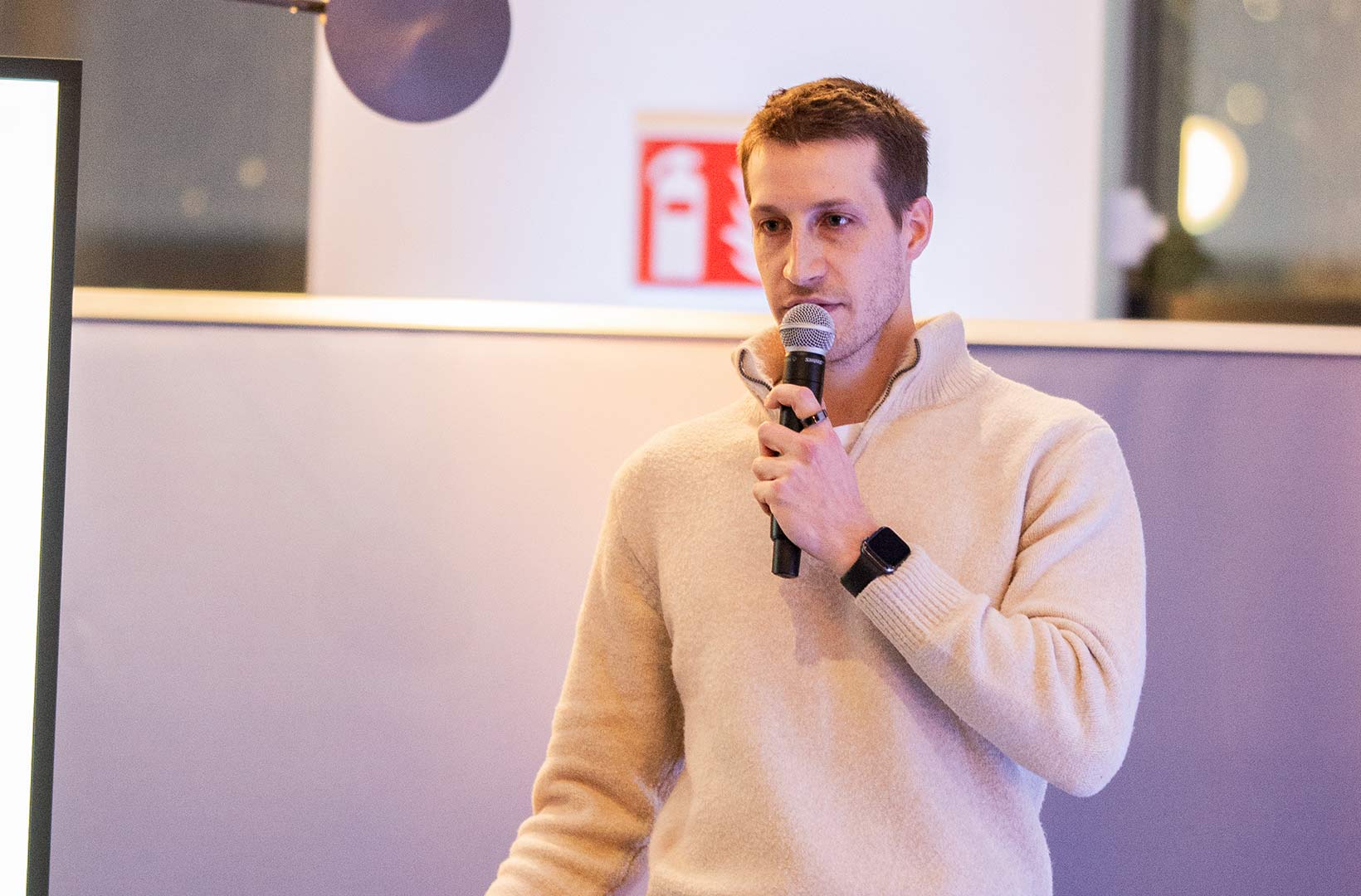 Science Parks VD Gustav Österström står framför en publik och pratar i mikrofon.